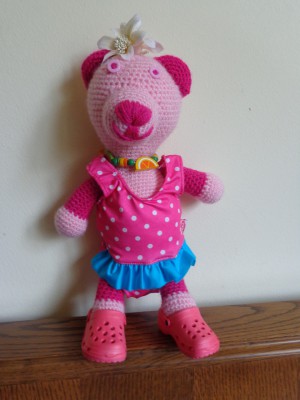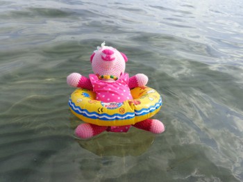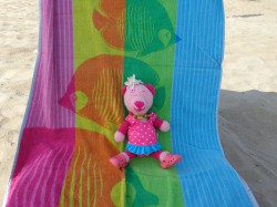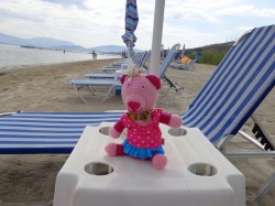 So, endlich endlich hat sich Frau Mitzibär nach über 3 Monaten hier auf Korfu (!!!) entschlossen, doch an den Strand mitzugehen. Sie sagte es wäre ihr immer zu heiss, aber ich glaube, das war eine Ausrede !!! das ist Frau Mitzibär im Strandoutfit und im Reisedress