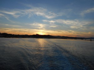 Ich war noch nie mit so einer grossen Fähre unterwegs und mir gefällts richtig gut. Ich sitze um die Mittagszeit noch ca. 2 Stunden am Sonnendeck mit Trägerleiberl und kurzer Hose. Aber je weiter wir nordwärts schiffen, umso mehr verliert die Sonne ihre Kraft.